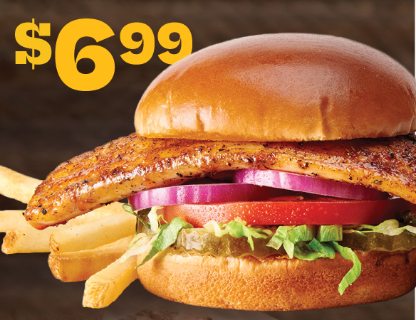 $6.99 BLACKENED FISH SANDWICH Every Friday now through April 3. Blackened tilapia with lettuce, onion, tomato, and pickles. Served with french fries.