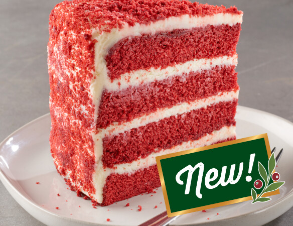 The perfect ending to your holiday celebration! Layered with cream cheese frosting and covered with chocolate shavings and crumbles of red velvet cake.