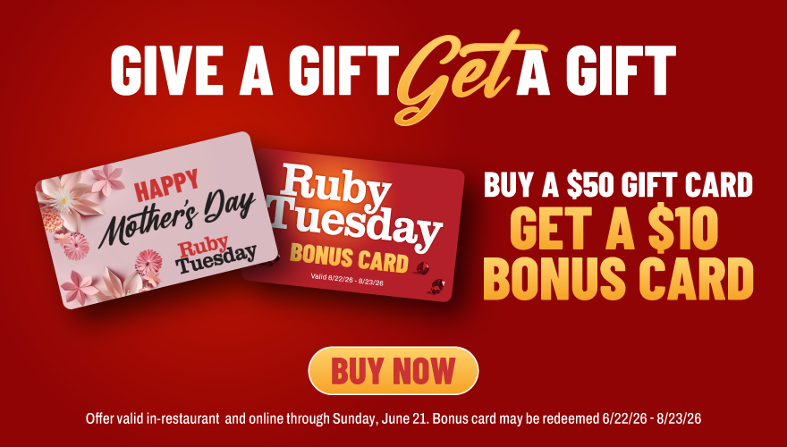 Spoil her with a Ruby Tuesday gift card so she can come back anytime and enjoy her favorites. For a limited time, purchase a $50 gift card and receive a $10 bonus card! See details below.