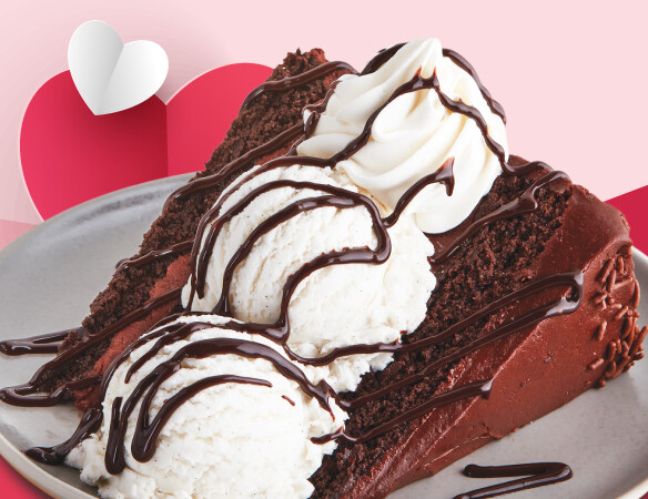 Indulge in a layered chocolate cake with rich chocolate fudge frosting and topped with vanilla bean ice cream and whipped cream.